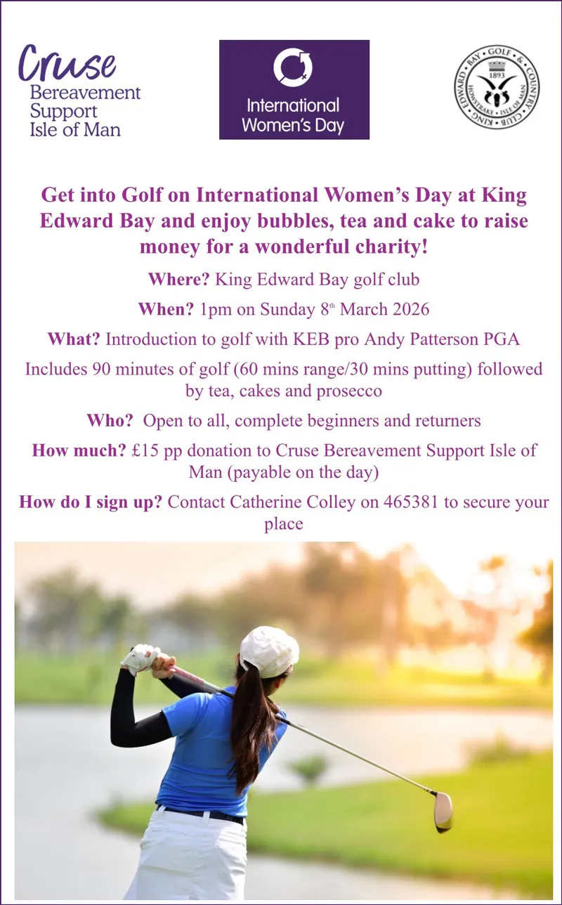 Get into Golf on International Women's Day at King Edward Bay and enjoy bubbles, tea and cake to raise money for Cruse!